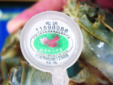 為了避免其他大閘蟹冒充陽澄湖大閘蟹,陽澄湖大閘蟹每年都更換防偽指環 ,今年的防偽指環將正面的背景色改成了綠色,指環上方標著防偽查詢電話,下方標著短信查詢號碼,背面則是網狀的密封格,揭開后是一個查詢編碼。據介紹,這個編碼是每只蟹子一個,而且整個防偽指環是一次性的,必須要撕毀后才能取下,以防被二次使用。